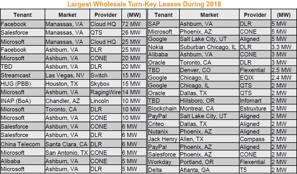 CloudHQ landed another big lease in 2018: a 25MW commitment from Microsoft, which also signed a 20MW lease with CyrusOne and a 14MW lease with RagingWire; QTS Realty got Salesforce to sign a 26MW lease; and Digital leased an additional 20MW to a customer the report did not name.
